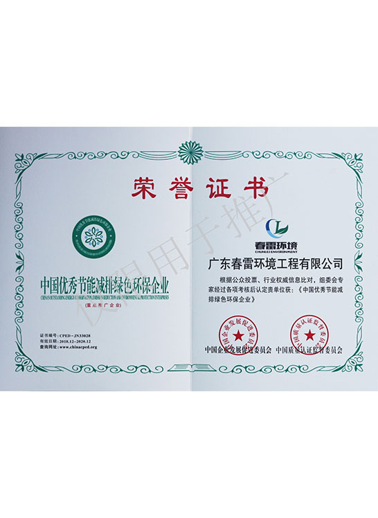 榮譽證書-中國優秀節能減排綠色環保企業